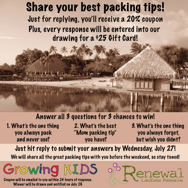 Zip-Lock bags are great for packing items that can leak and it never hurts to throw a few extras in there. A few of our customers have also said they have used different sized zip-locks and placed one full children’s outfit into each bag. Or even the dry cleaners plastic that you would otherwise have thrown out (special thank you to Hope’s Mom!)